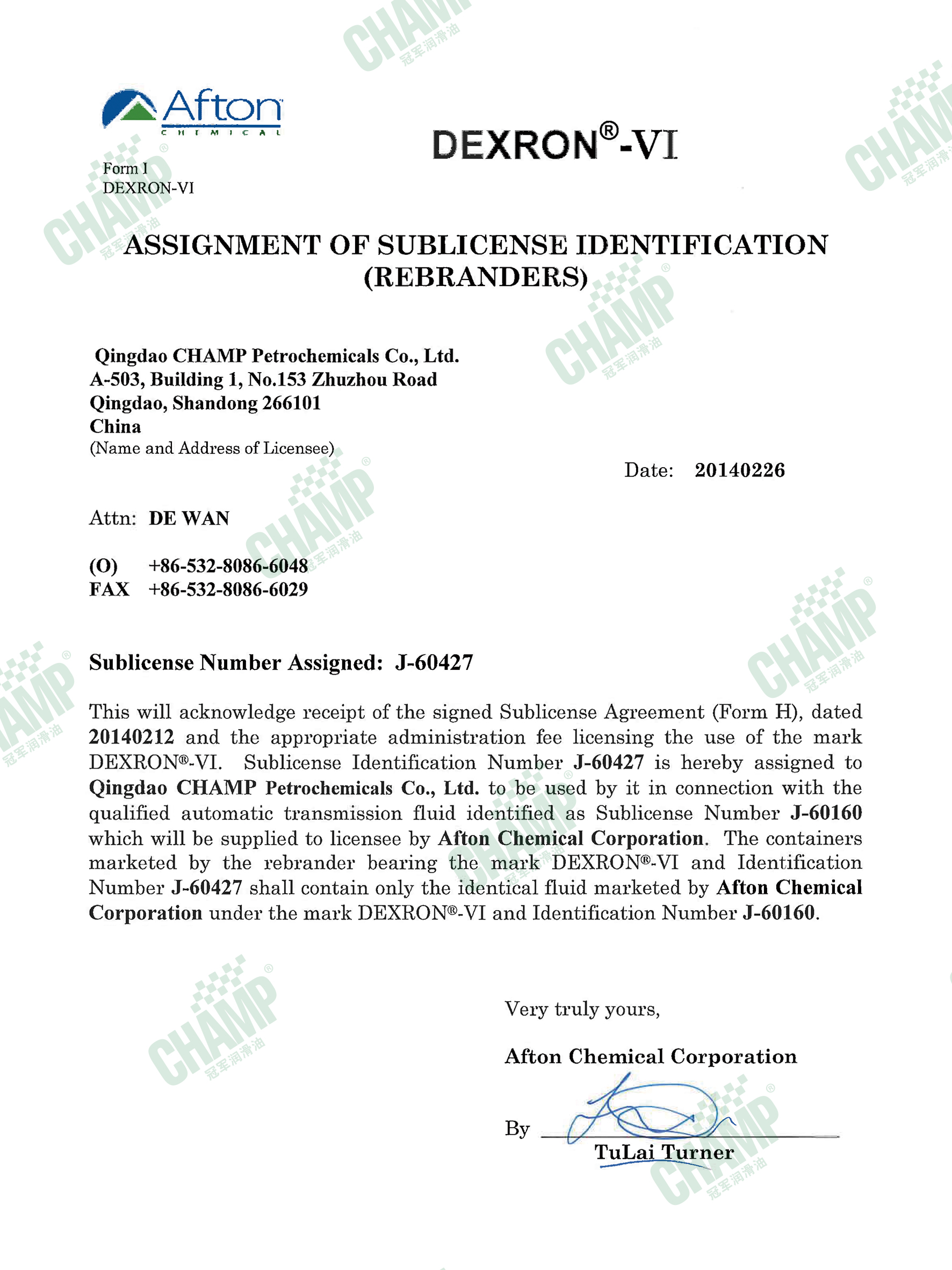 冠軍傳動寶ATF 6000酯類全合成自動變速箱油獲得美國通用汽車Dexron VI認(rèn)證(J-60427)。采用新型添加劑技術(shù),可應(yīng)用于要求使用低粘度標(biāo)準(zhǔn)的6速、7速、8速及9速自動變速箱中,能夠提供卓越的換擋操控性和節(jié)油性能。