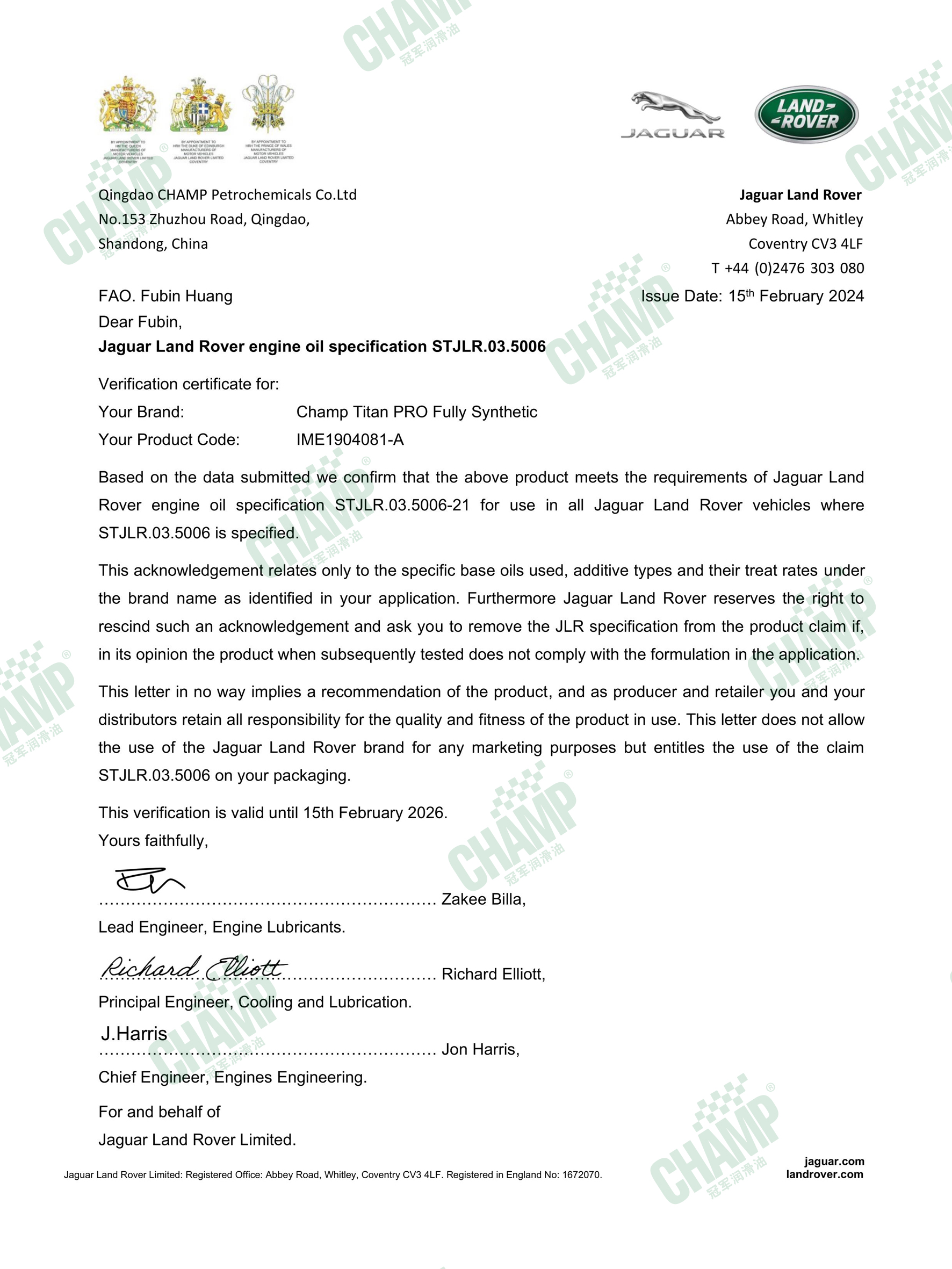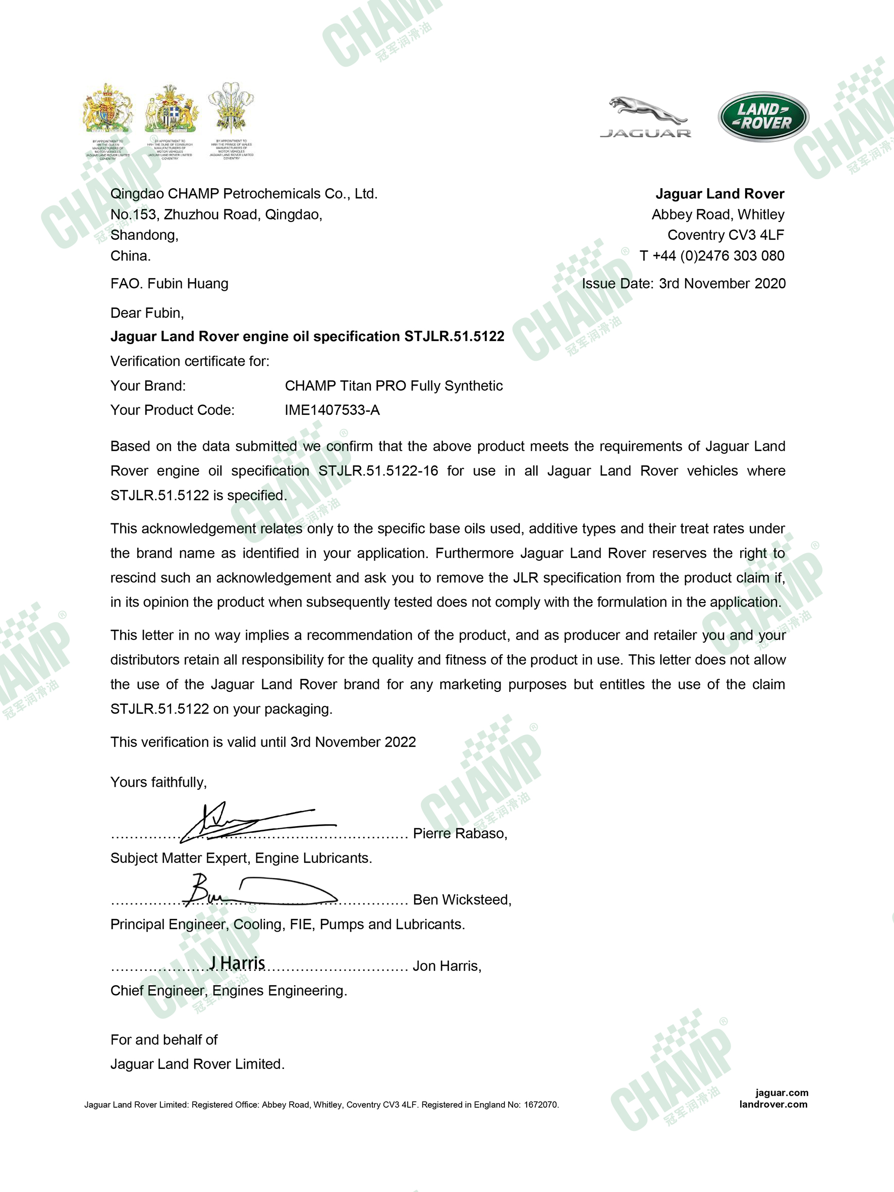 冠軍?乘用車發(fā)動機油產(chǎn)品通過多個汽車品牌制造商原廠認(rèn)證