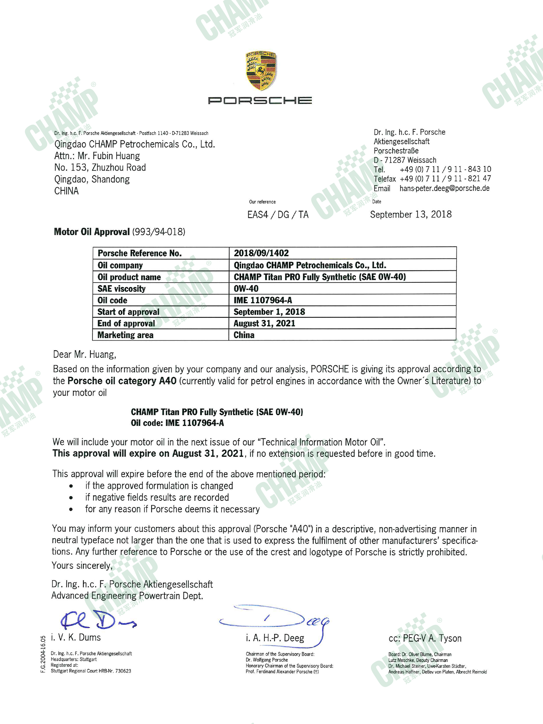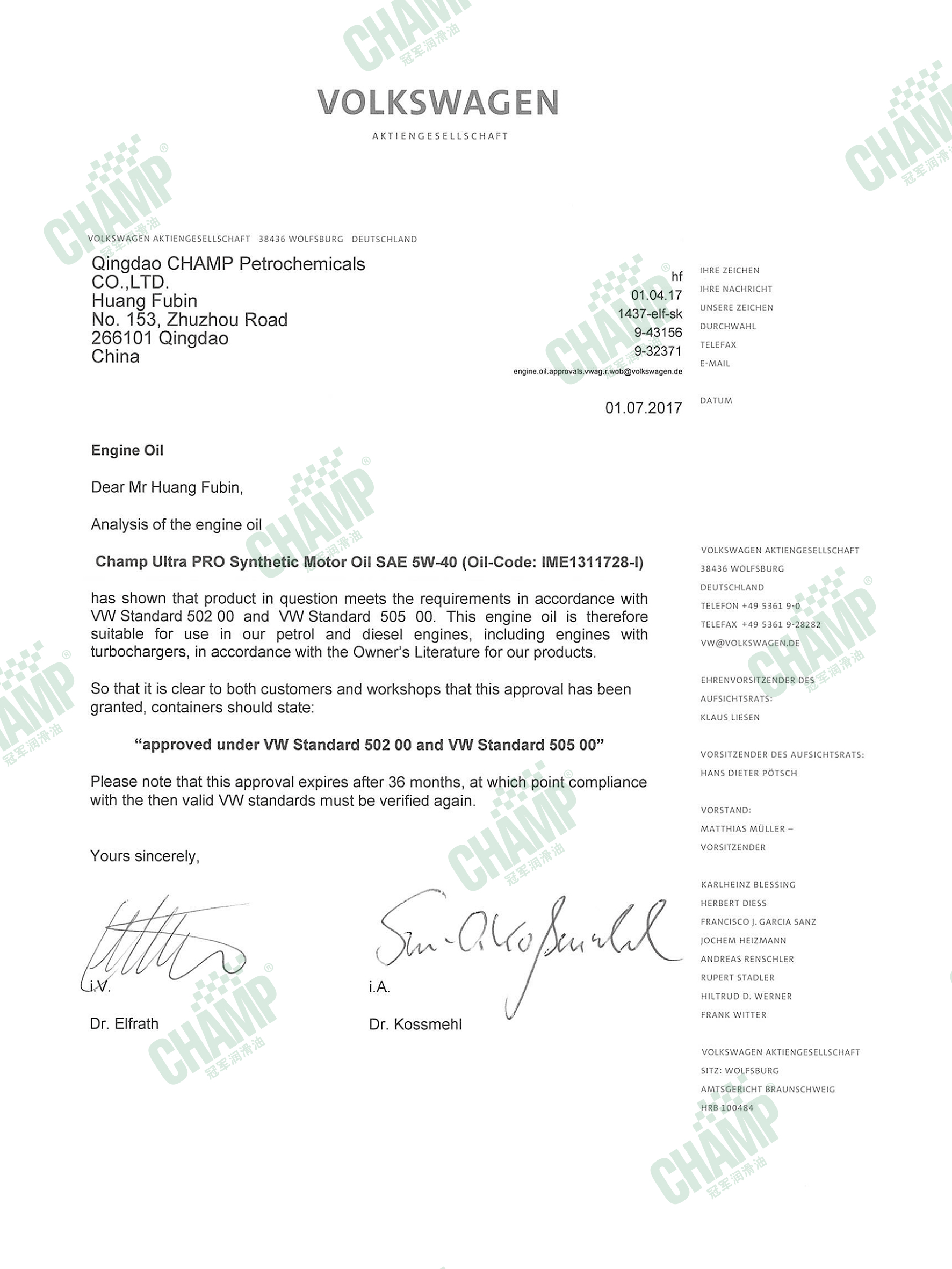 冠軍鈦能、嘉能系列的多款發(fā)動機油獲得大眾汽車VW 50200/50500、VW 50800/50900、VW 50400/50700認(rèn)證。