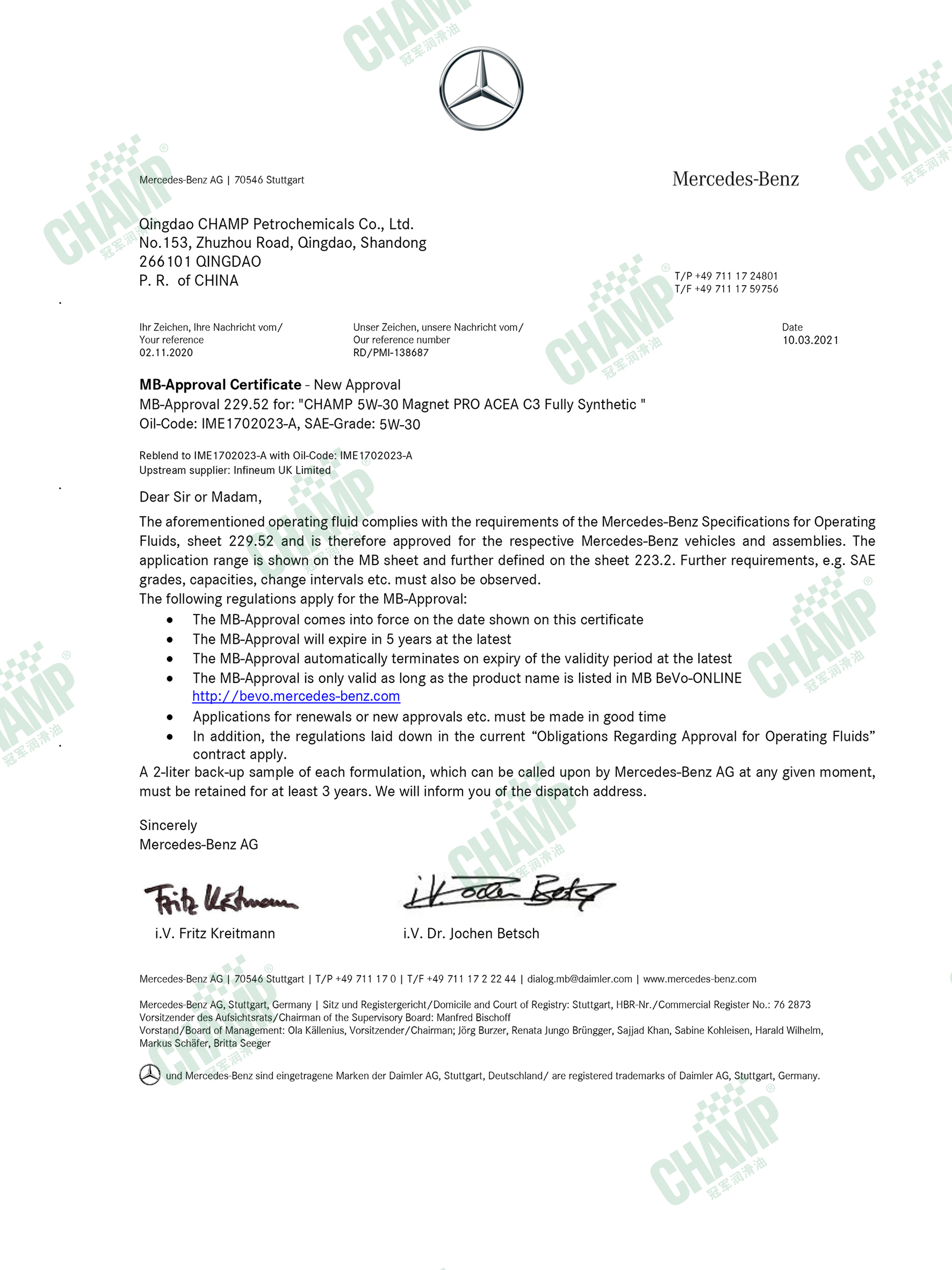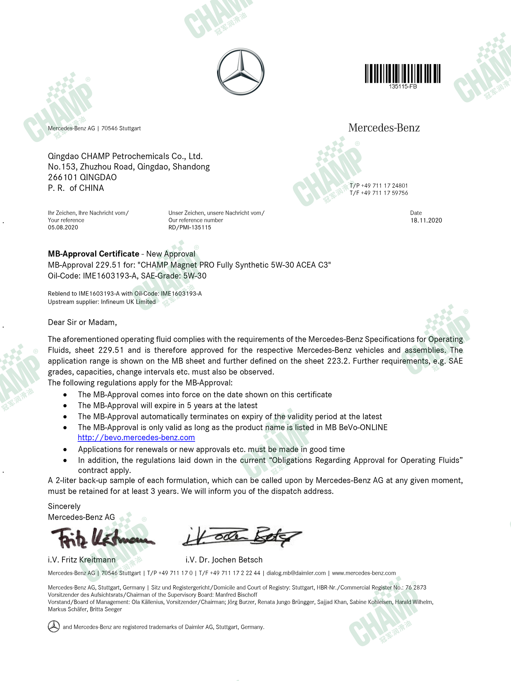冠軍鈦能、磁能、嘉能等多款發(fā)動機油產(chǎn)品獲得奔馳汽車原廠認(rèn)證,是擁有奔馳乘用車長效認(rèn)證“大滿貫”的潤滑油品牌。