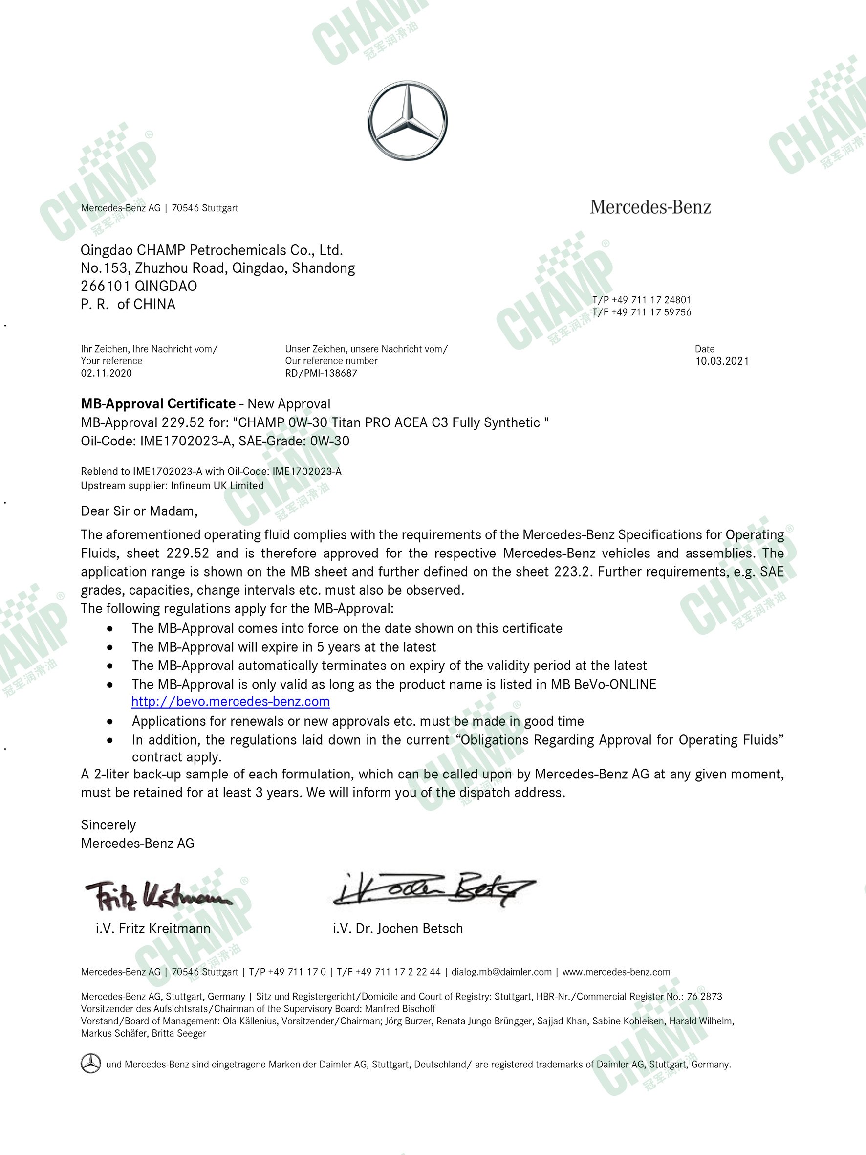 冠軍鈦能、磁能、嘉能等多款發(fā)動機油產(chǎn)品獲得奔馳汽車原廠認(rèn)證,是擁有奔馳乘用車長效認(rèn)證“大滿貫”的潤滑油品牌。