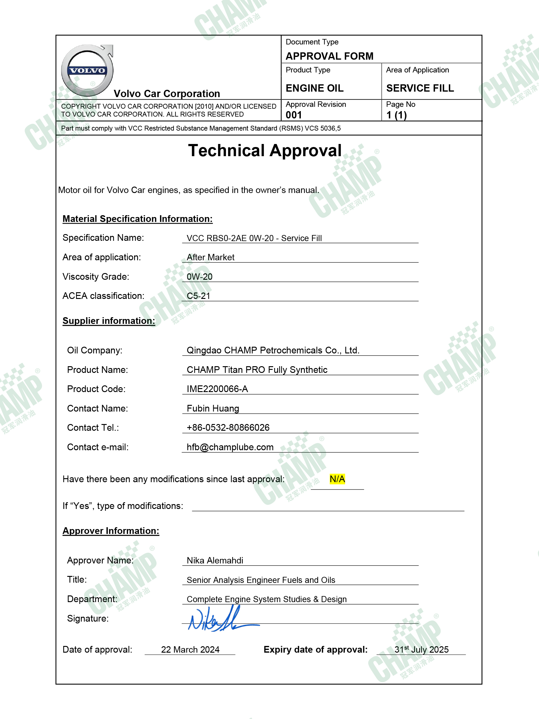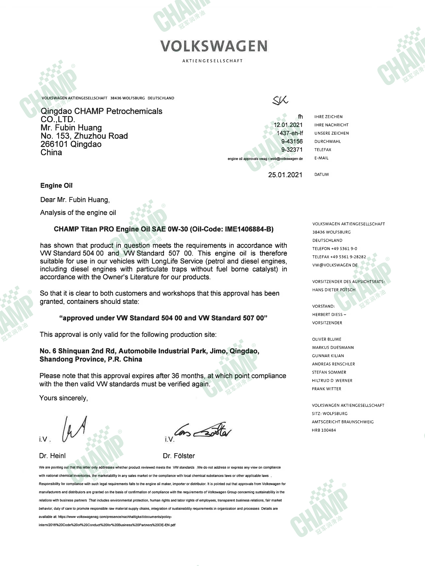 冠軍鈦能、嘉能系列的多款發(fā)動機油獲得大眾汽車VW 50200/50500、VW 50800/50900、VW 50400/50700認(rèn)證。