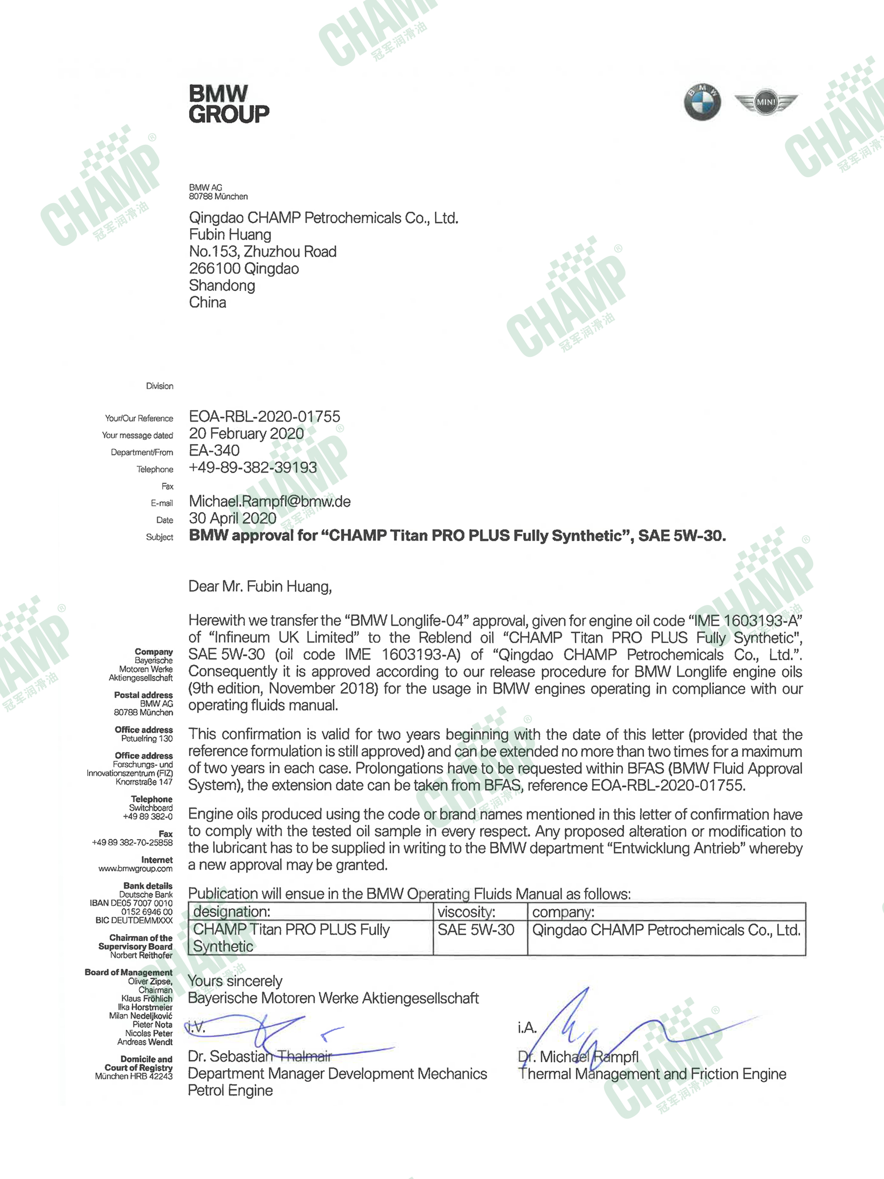 冠軍?乘用車發(fā)動機油產(chǎn)品通過多個汽車品牌制造商原廠認(rèn)證
