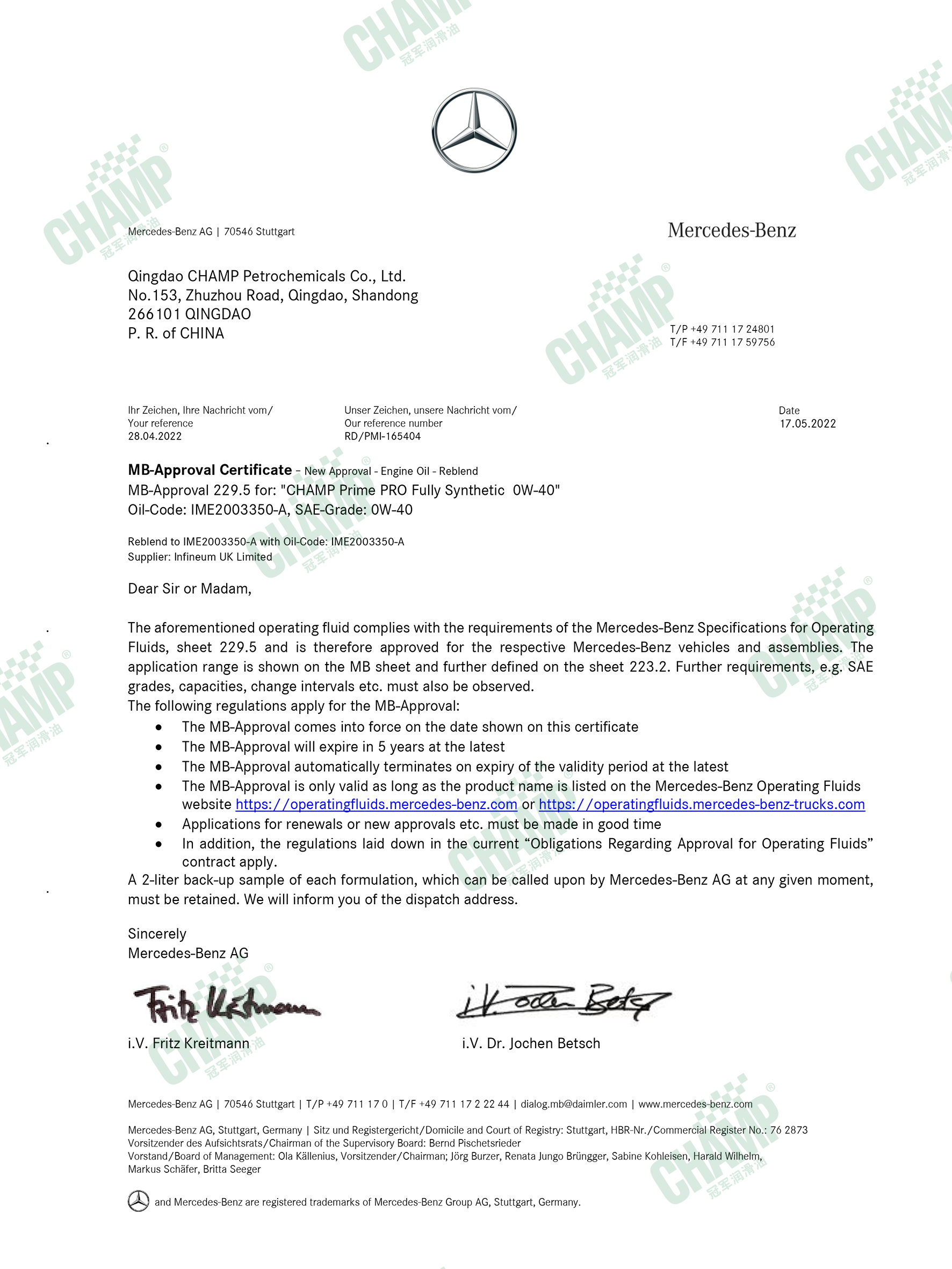 ◆ 奔馳MB-Approval 229.5認(rèn)證;